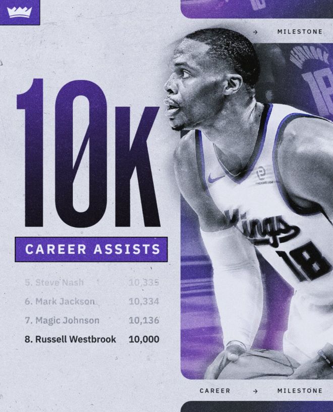 国王不敌森林狼,这场比赛拉塞尔-威斯布鲁克顶替了丹尼斯-施罗德的先发控卫席位,他完成了个人10000助攻的里程碑,虽然最终国王输球了,但这个夜晚威少绝对是整个NBA最吸睛、最闪耀的那个人。